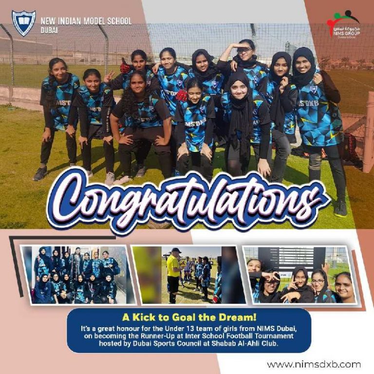 Congratulations to NIMS Middle School Dubai, for making their school and their loved ones proud by winning the Runner-Up title at the Inter School Football Tournament hosted by Dubai Sports Council at Shabab Al-Ahli Club. The Under 13 team of girls gracefully competed against Gems Wellington to attain this remarkable victory.