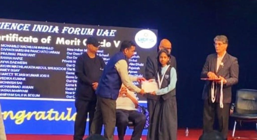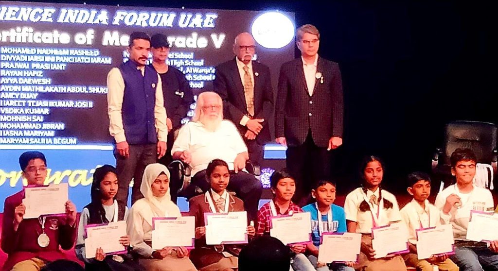 Science India Forum UAE conducted shastra Prathibha contest and announced the shastra Prathibas of 2022-23 in the event SCIENCE GALA 2022-23 at Bits Pilani Academic city.The occasion was graced with the presence of Padma Bhushan Sri Nambi Narayanan aerospace scientist(ISRO). The students received medals and certificates from him and got a unique interaction opportunity with the legend.