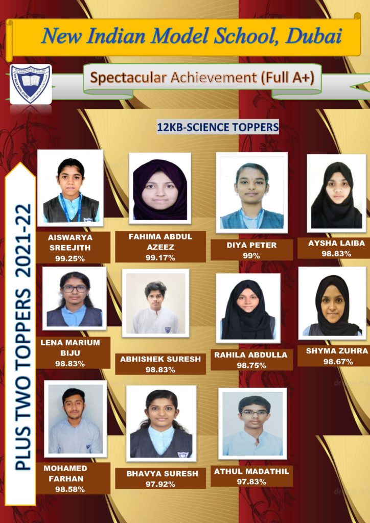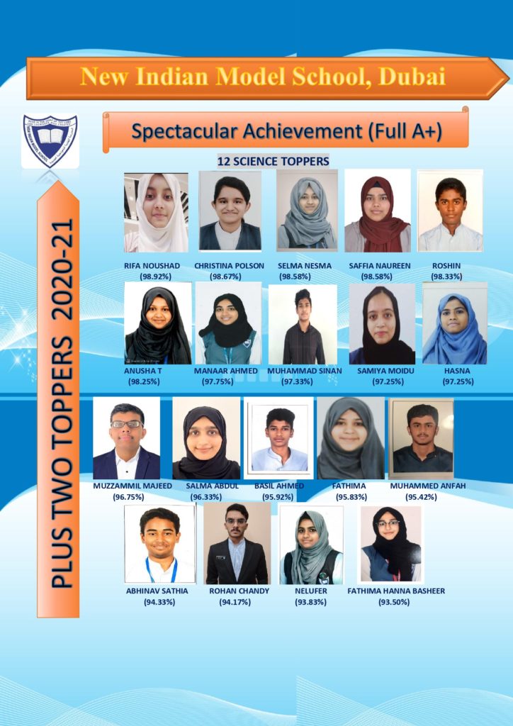 New Indian Model School, Dubai produced 100% result in the All Indian Senior School Certificate Examination (Class XII) conducted by CBSE in March 2016. 109 students appeared for the examination which consists of 62 in Science and 47 in Commerce.