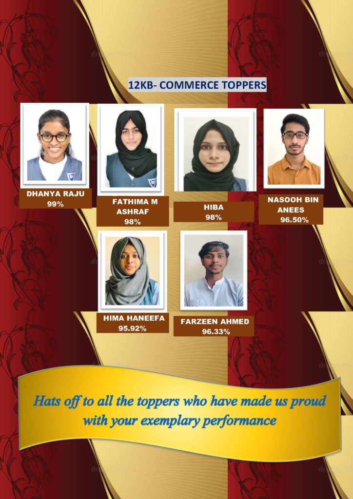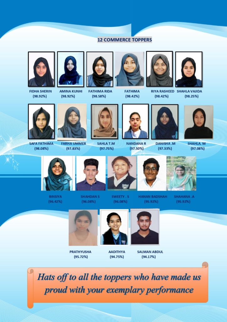 In Commerce stream MOHAMED AJMAL ASHRAF, JANEETA KUZHUMURIYIL MATHEW and SAHEEN MUHAMMAD secured A+ in all 6 subjects with 93.33, 92.5 & 92.25 % respectively. But JANE MATHEWS JOHN got 94.25 % though she could score only 5A+ and 1A. HASEEBA BADARUDEEN HAMEED and ALEENA THOMAS JOSEPH obtained 5 A+ & 1 A with 93.17 and 92.42 % marks.
